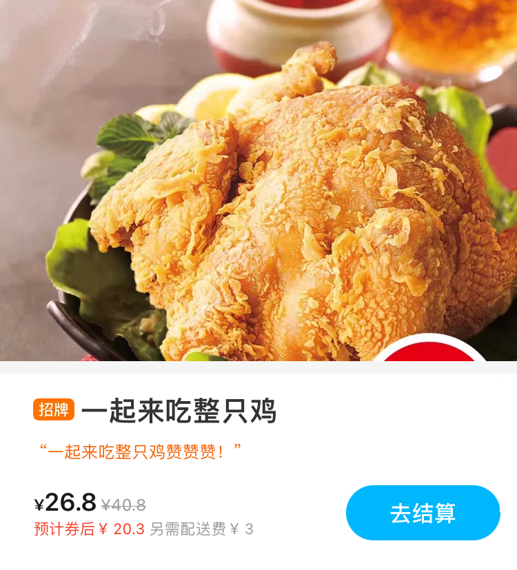 点外卖时,也出现了同样的情况,炸整鸡还可以满减,算下也才二十多元。