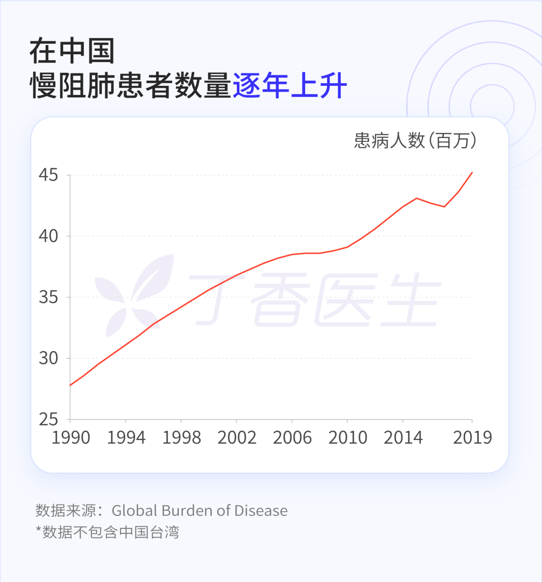 2018 年著名医学期刊柳叶刀( The Lancet)刊登的关于中国慢阻肺患者的数据显示,中国病患者人数为 9990 万人,约 1 亿人,已经成为与高血压、糖尿病「等量齐观」的第三大慢性疾病。