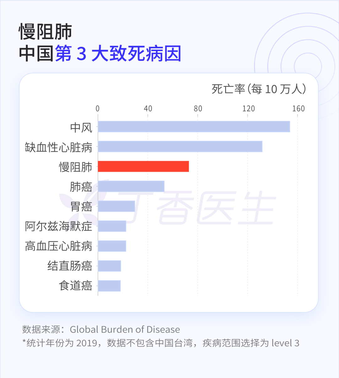根据 2019 年公示的《全球疾病负担》数据,慢阻肺已经成为中国第三大致死病因,仅次于中风和缺血性心脏病,甚至连肺癌都排在它之后。