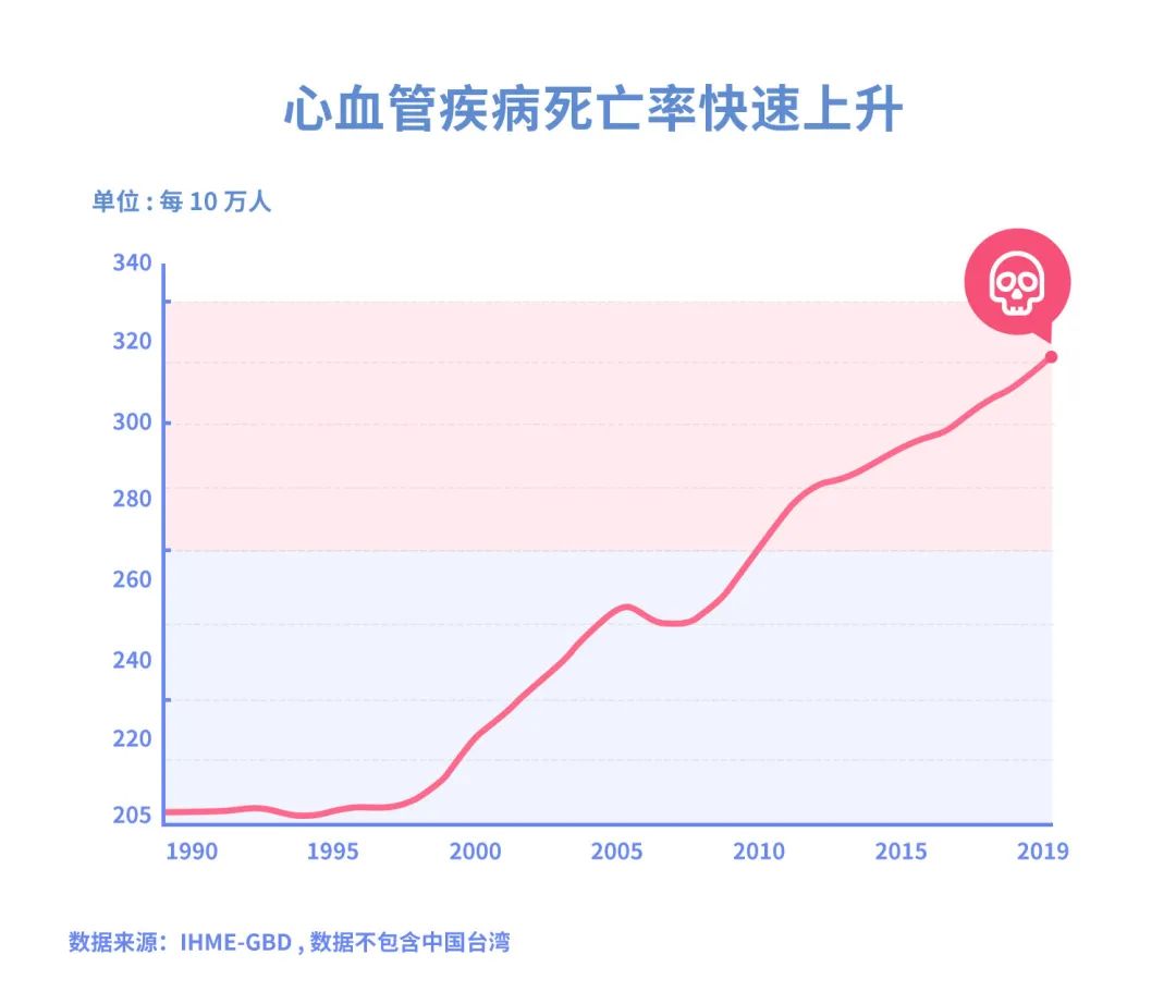 30 年来,我国整体心血管疾病的死亡率,呈现出快速上升的趋势。从 1990 年的 205/10 万,增长到 2019 年的 322/10 万,每 10 万人死亡率是 30 年前的 1.6 倍。
