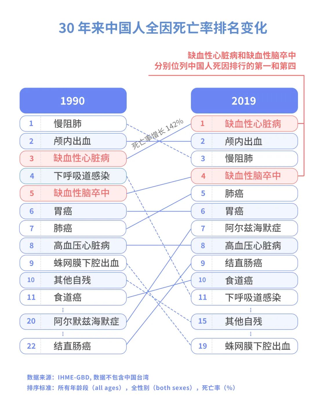 在过去 30 年里,冠心病(缺血性心脏病)的死亡率增长了 142%,仅这一个疾病造成的死亡,就约等于我国前五大癌症死亡人数的总和 *。