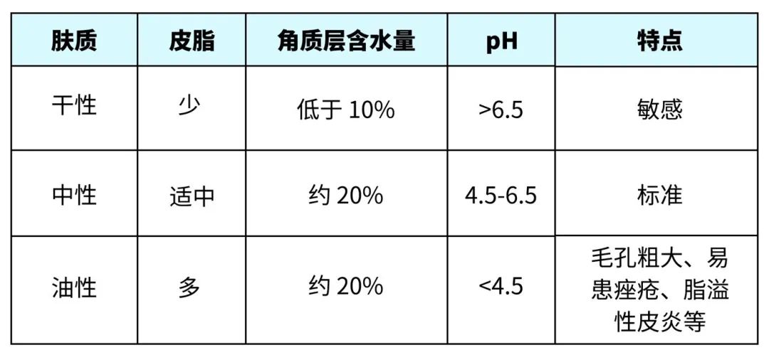 不同肤质的区分,大家可以通过洗脸前后皮肤是否紧绷,来简单判断。也可以对照下面的表格判断: