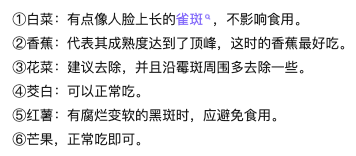 白菜、香蕉、茭白、芒果的黑点基本上可以认为正常,花菜和红薯上的就要稍微注意一点咯。