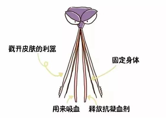 最外面的 2 根,用来扎开皮肤;稍靠里的 2 根,用来固定身体;最中间的 2 根,一根用来吸血,一根释放唾液。